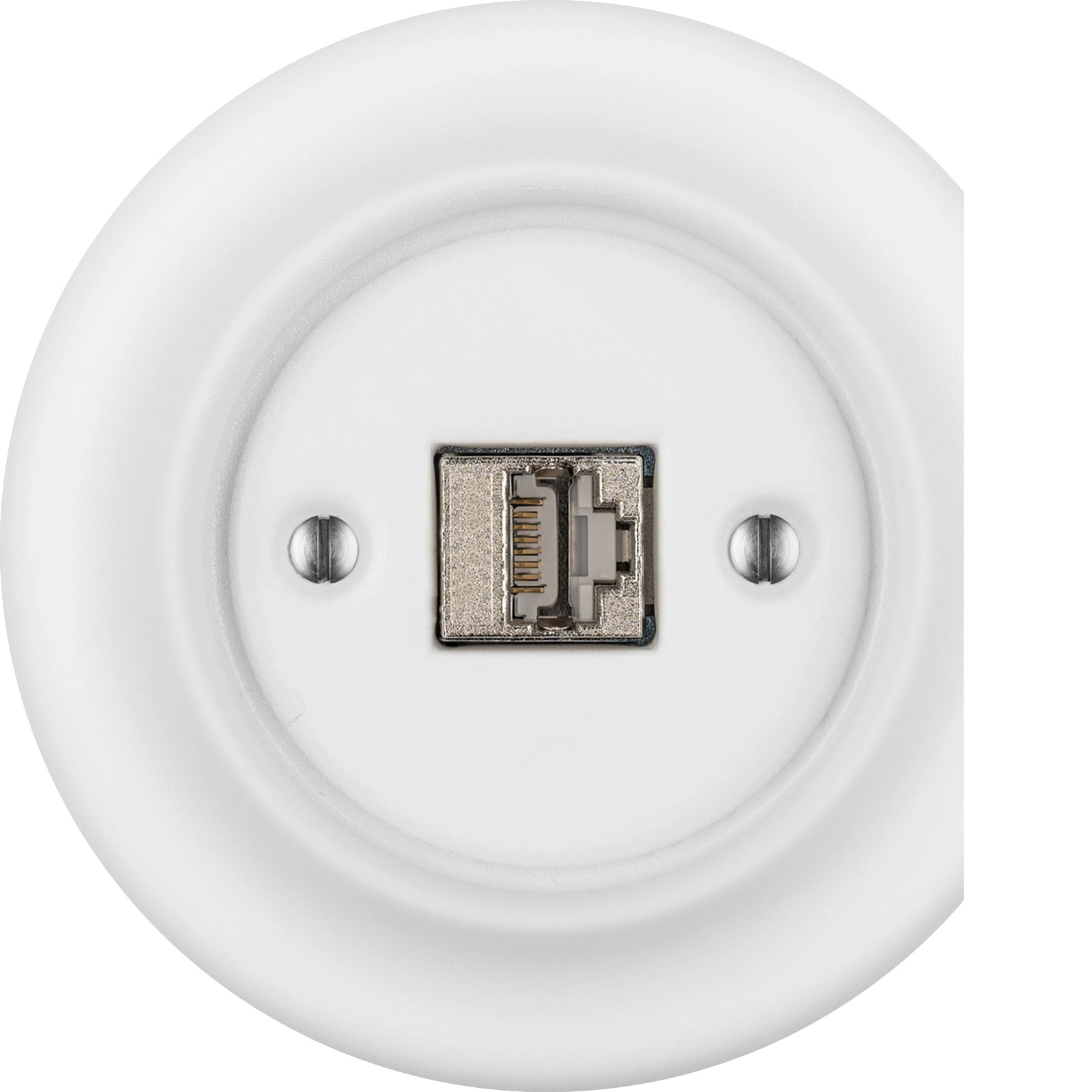 Mrežna utičnica RJ45 u retro stilu u mat bijela, izrađena od tradicionalnog porculana. Proizvod je otporan na prašinu, ima stalnu boju i površinu vrlo otpornu na habanje. Emajliran je i ručno izrađen u vrhunskoj kvaliteti. CE certifikat sukladnosti. Ukrasni poklopac. Garancija 50 godina!